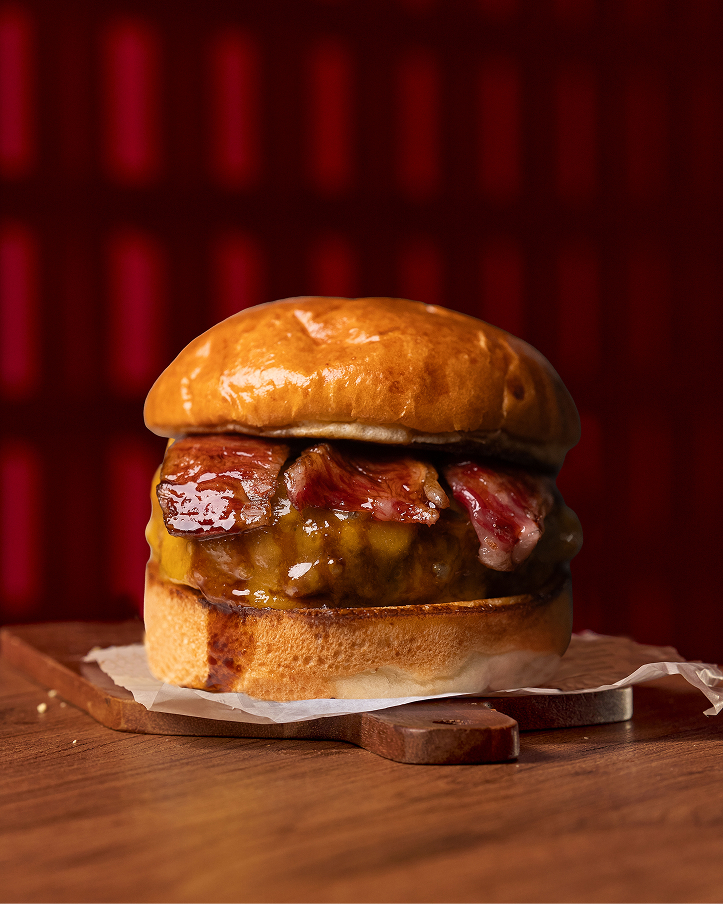180grs de carne madurada 45 días con 30% de chuletones, cheddar fundido y láminas de wagyu A5 bms1012 acabadas con una pincelada de nuestra demi glace de huesos de nuestros chuleteros y verduras cocinada durante 16 horas.