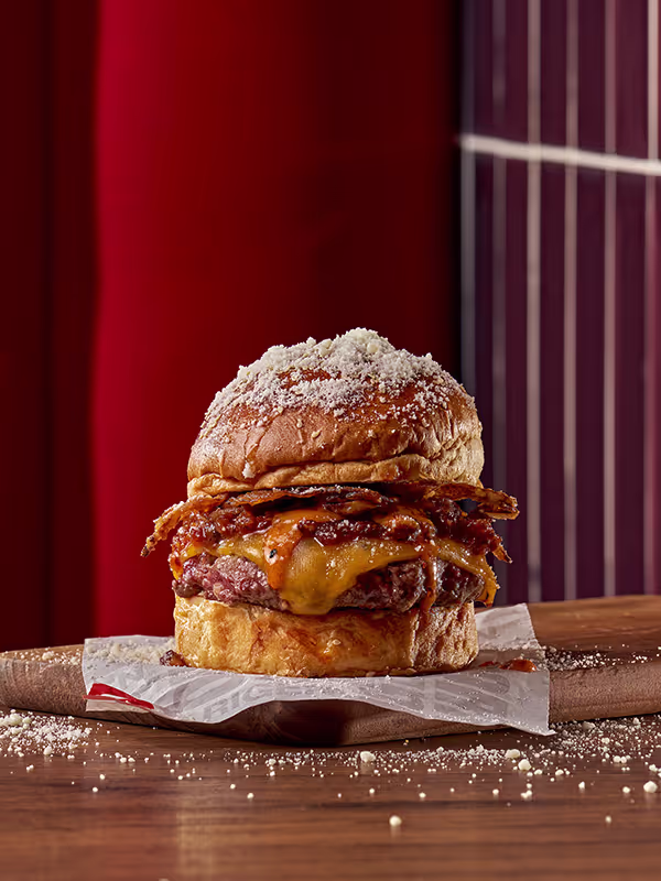 Si eres amante de la carne, ésta es tu burger; 180grs de vaca madurada durante 45 días en nuestras cámaras, con un 30% de chuletón, doble de cheddar, bacon ahumado y un toque de nuestra salsa mayo-bacon.