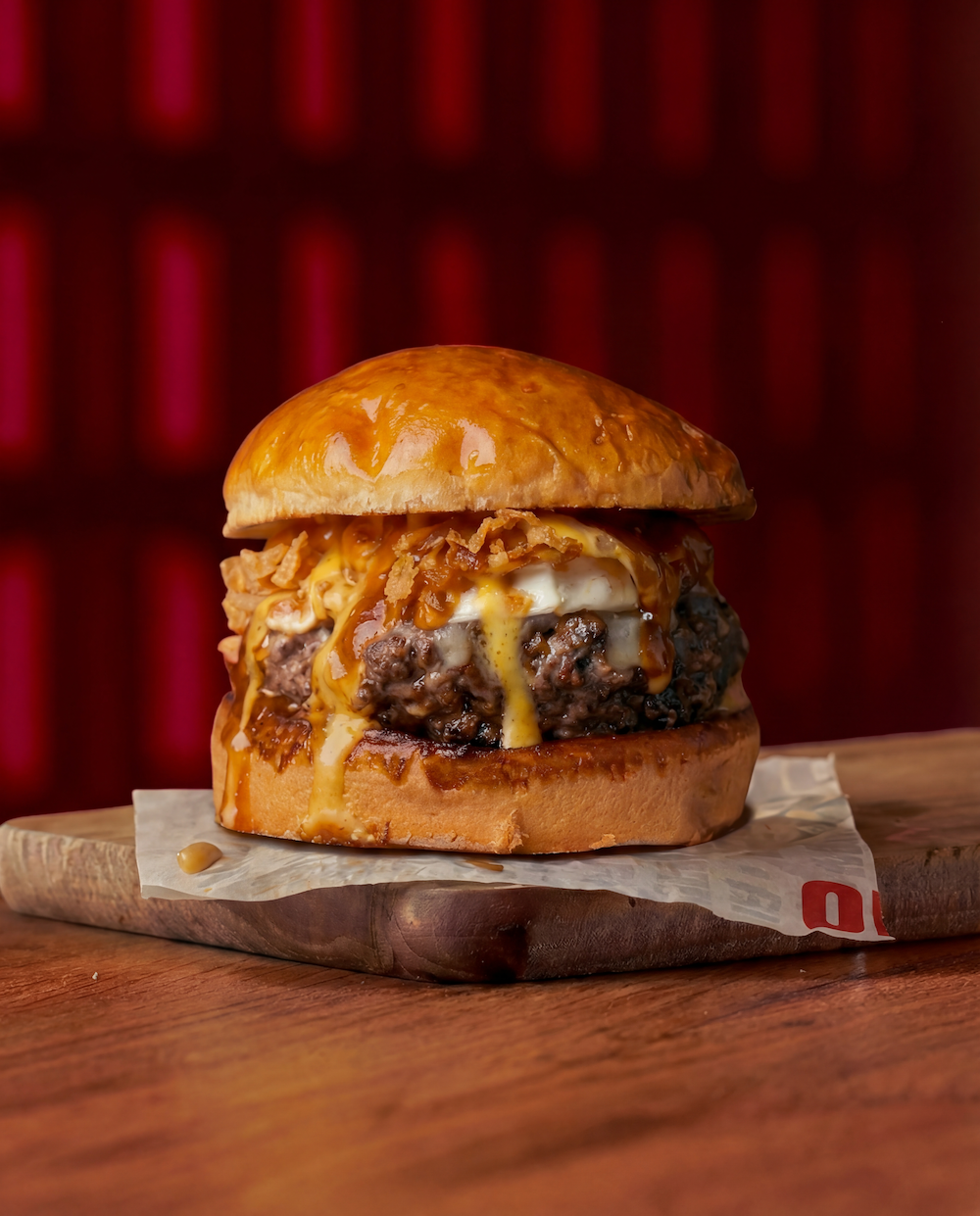 Doble patty de 90 grs, queso cheddar inglés curado por 14 meses, cebolla caramelizada y salsa de chiles fermentados.